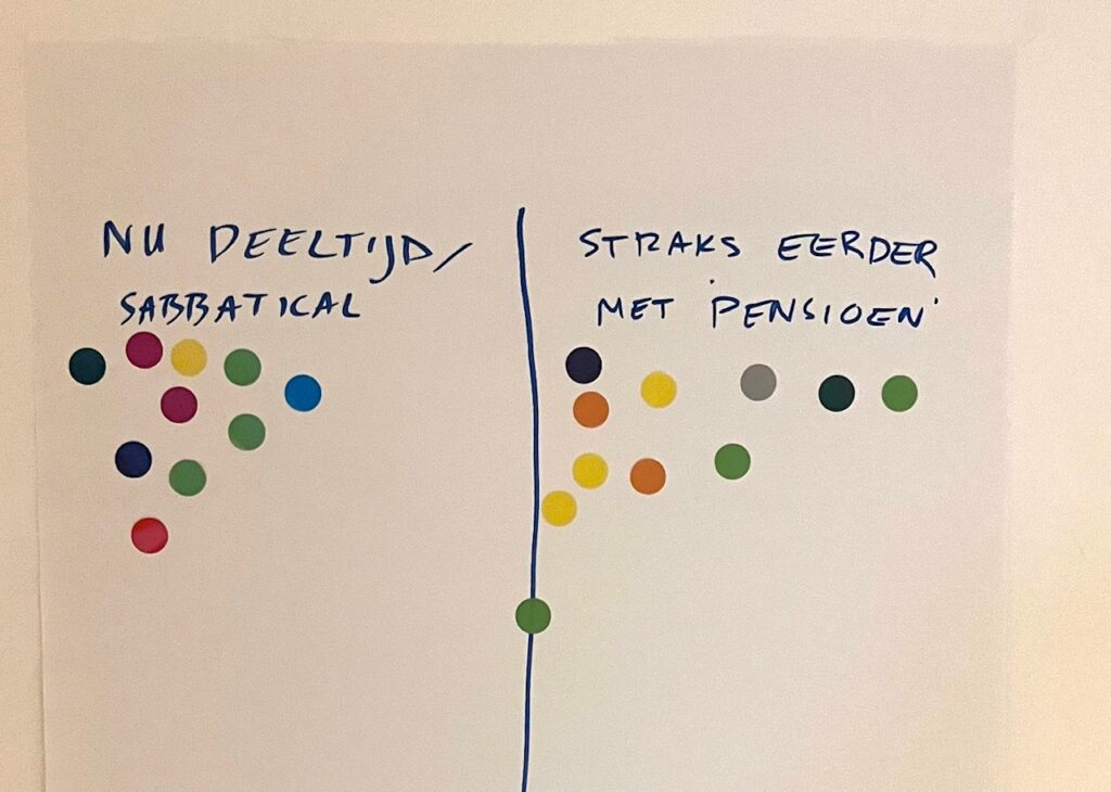 Nu deeltijd of sabbatical of straks eerder stoppen met werken? Nou, dat is moeilijk kiezen! Er was zelfs iemand die er niet uitkwam en dat graag kenbaar wilde maken. Wil deze persoon allebei? Ligt hij/zij wakker van de keuze? Mocht jij de groene stippert op de middenlijn zijn, verklaar je nader! Met deze keuze heb je de stand precies op het midden weten te houden, want dit dilemma eindigt in een remise.