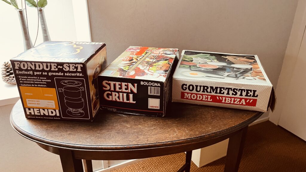 De rest van het jaar ligt dat enorme ding toch in de weg. Ik heb er ooit een voor mijn verjaardag gekregen, van een expat vriendin die een gourmetstel-steengril-combi aanzag voor een leuke authentieke lokale traditie van Nederlandse foodies. Ik baalde als een stekker, want ik hou niet van gourmetten of steengrillen. Nu moest ik een hele plank inruimen voor die enorme doos, in een berging waar sowieso al niet zoveel ruimte is. Toen de gelegenheid zich aandiende, heb ik hem ‘uitgeleend’ aan iemand, en gelukkig heb ik hem nooit teruggekregen.