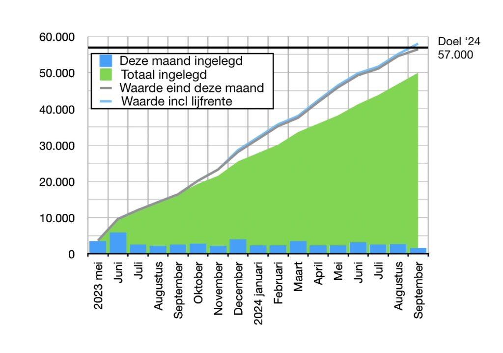 Ik had voor 2024 een doel: 30.000 meer hebben dan in 2023. Dat betekent €57.000, en ik kan met vreugde mededelen: daar ben ik sinds vorige week al! De stand was op de laatste beursdag van september precies €57.994. Morgen kan de beurs natuurlijk weer kelderen en dan ben ik er niet meer, maar de trend is in ieder geval immer geradeaus, en himmelhoch jauchzend.