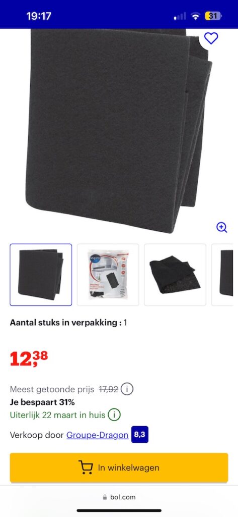 Gisteren op de fiets naar het station realiseerde ik me dat zo’n filter vast bestaat uit materiaal dat op meer plekken gebruikt wordt. In de trein heb ik opgezocht wat voor materiaal het is, en of je dat goedkoper kunt krijgen. Ja, dat kan: het zijn koolstof geurfilters, en die zitten in veel meer dingen, waaronder afzuigkappen.