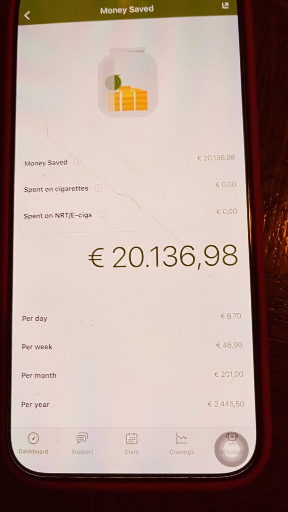 Wat mij nog meer zou motiveren, is het financiële deel. Er is een hele tab in de app gewijd aan hoeveel geld je hebt bespaard. Dat van haar staat nu op ruim €20.000 in totaal, maar ze zei erbij dat dat veel te laag is, omdat de app geen rekening houdt met prijsstijgingen, en de prijs van een pakje sigaretten enorm is gestegen. Laten we eens kijken of we een betere schatting kunnen maken aan de hand van de informatie die ik heb.