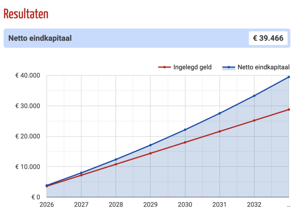 Onze betrouwbare vriend berekenhet.nl heeft het antwoord op hoeveel mijn vriendin zou kunnen hebben als ze dat gedaan had. Ook hier heb ik het gemiddelde van €3595,25 per jaar genomen, dus helemaal klopt het niet, maar je snapt het idee wel, hoop ik.